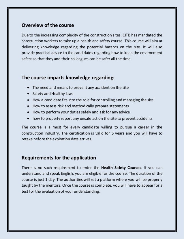 Health and safety course is to teach an applicant about the most common hazards of health and safety in the workplace and the reduction of these hazards.